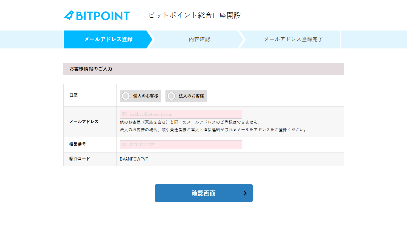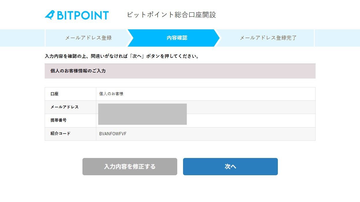 紹介コードの欄に「BVANFOWFVF」が入力されていることを確認してください!(ここを忘れると、1500円分の仮想通貨を受け取れなくなります)