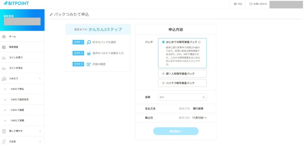 例えば「はじめての暗号資産パック」に月1万円をつみたてる場合は、
