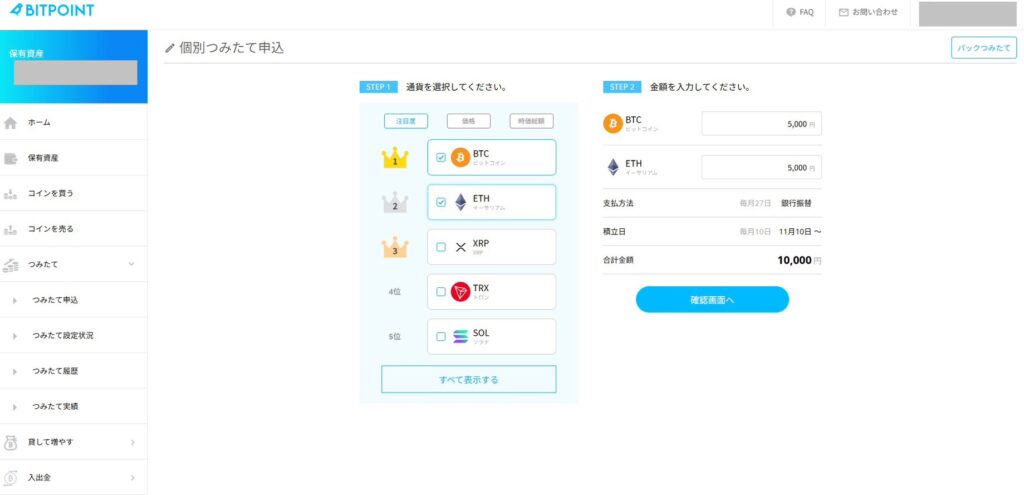 ②個別つみたて→個別の仮想通貨をつみたてる方法