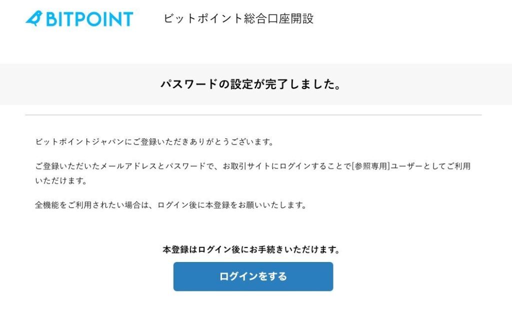 登録手続き後、ビットポイントが審査をして問題がなければ、登録したアドレスにメールが届きます。これで口座開設は完了となります!