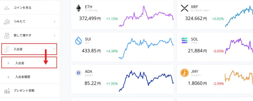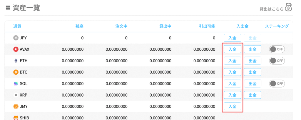 メニューから入出金をクリックした後、資産一覧の画面に移ります。入金を希望する暗号資産の「入金」ボタンをクリックしてください。