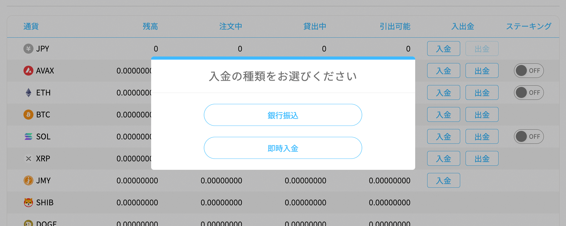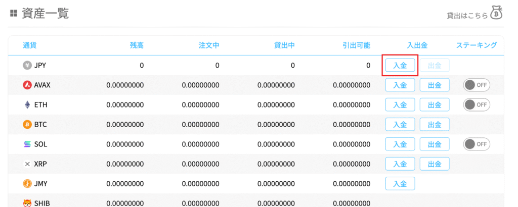 資産一覧が表示されますので、JPYの右側にある「入金」をクリックしてください。