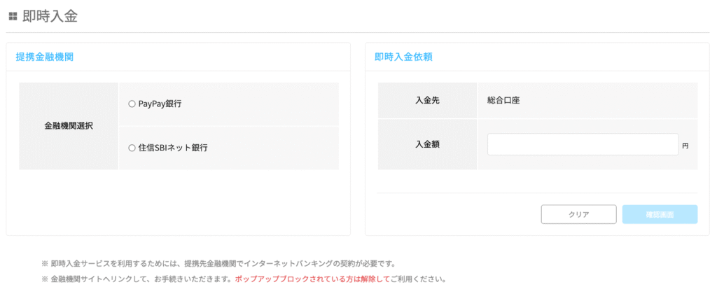 金融機関を選択し、入金額を入力してください。その後「確認画面」をクリックすると、金融機関のサイトに移動するので手続きを済ませてください。
