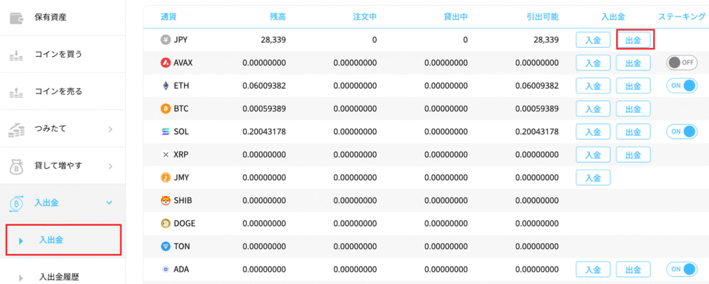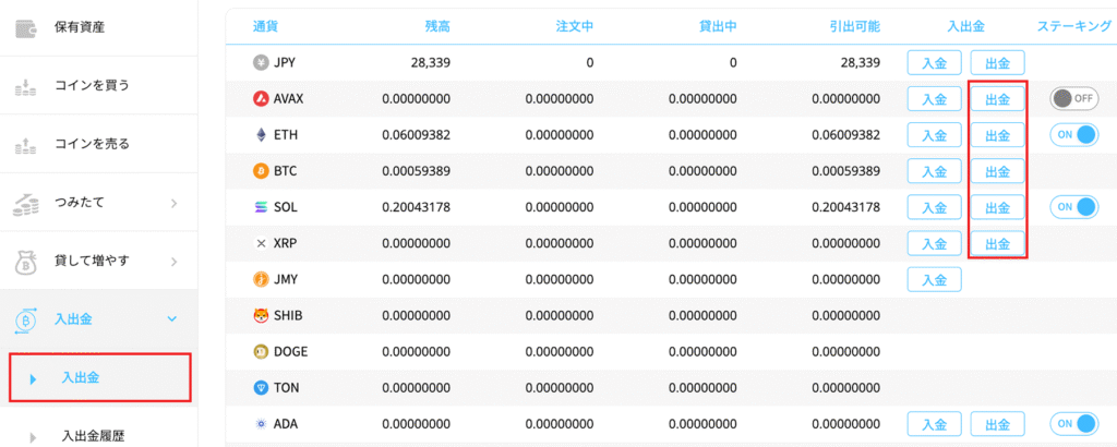 メニューから入出金をクリックした後、資産一覧の画面に移ります。出金を希望する暗号資産の「出金」ボタンをクリックしてください。