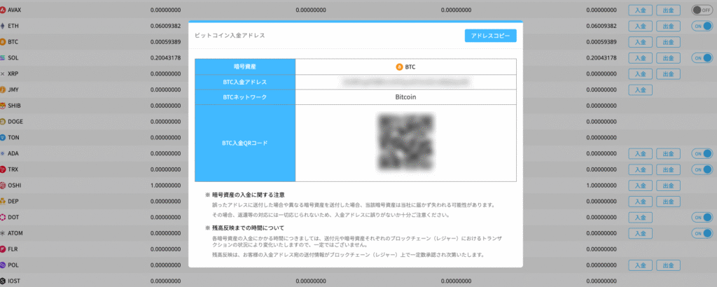 暗号資産のアドレスが表示されますので、間違いがないか十分に確認してから暗号資産を入金してください。