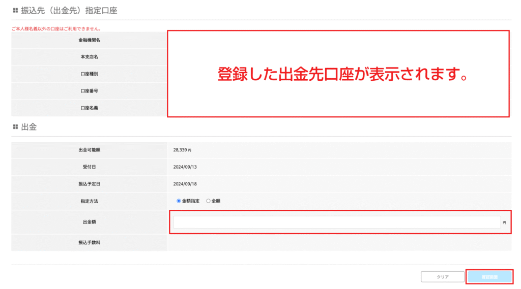 出金額を指定する場合は、金額指定にチェックを入れた状態で、出金額を記入して「確認画面」をクリックしてください。