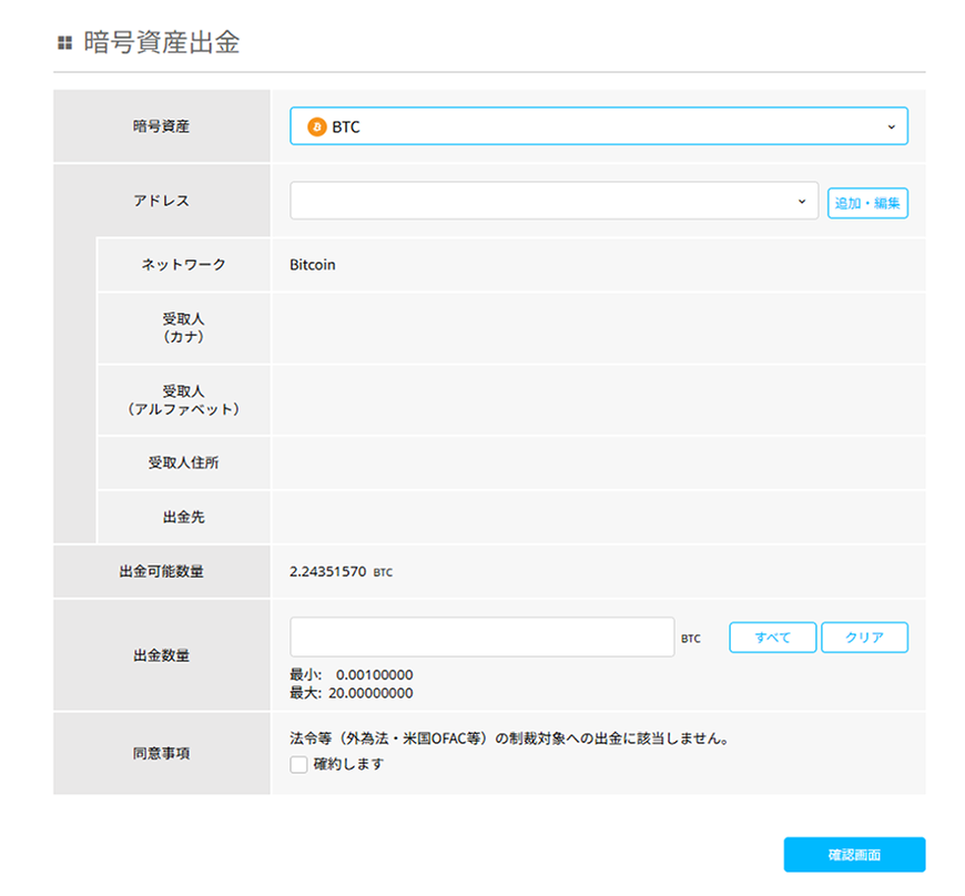 全額出金される場合は、全額にチェックをして「確認画面」ボタンをクリックしてください。